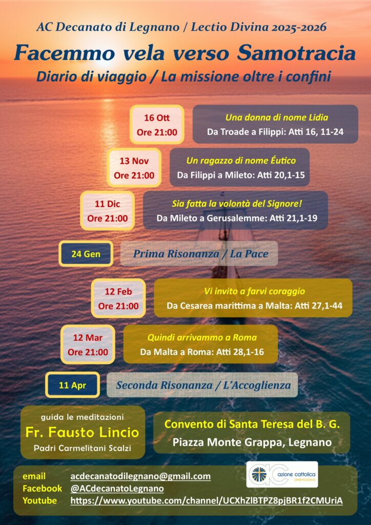 L’Azione Cattolica del Decanato di Legnano propone un percorso di meditazioni, nella formula della Lectio Divina, sviluppato su 5 tappe e 2 risonanze, da ottobre 2025 ad aprile 2026.